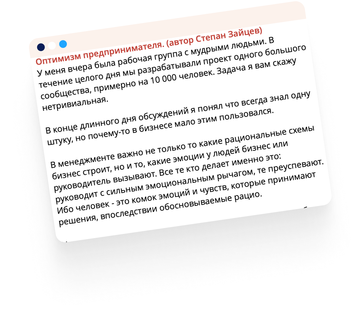 Сотрудничество со Степаном помогло мне привести в порядок хаос, который царил в моей компании. Благодаря его помощи мы смогли оптимизировать операционную систему, наладить совещания и отчетность. Теперь все работает слаженно и эффективно.